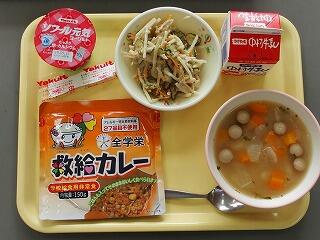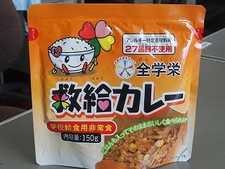 給食では、防災体験ということで、救給カレーが出ました。容器の中にごはんとカレーが一緒に入っているので、そのまま食器として食べることができます。毎年、メニューとして出ています。味も毎年進化しています。