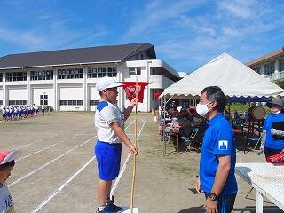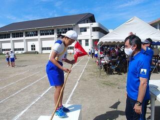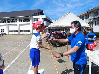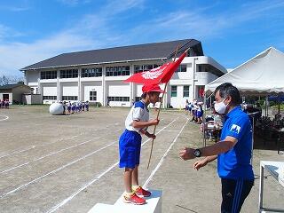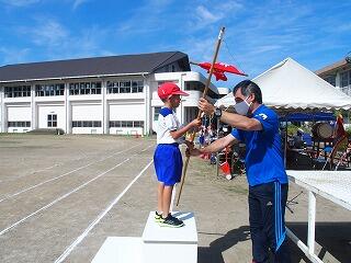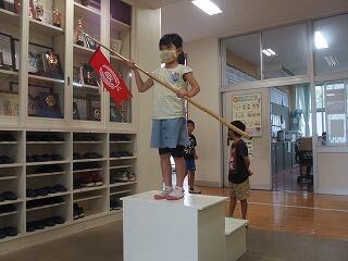 これまでは、体育科の授業で使うポートボール台を表彰台の代わりに使用していましたが、子どもたちにとって晴れの舞台であり、これまでの頑張りを認める意味でも、本物の表彰台で、ぜひ小優勝旗を受け取ってほしいという職員の思いもあり、教育委員会教育総務課に相談しましたところ、快く引き受けてくださり、営繕担当の皆様に作成していただきました。とても立派な表彰台で、「靴を脱いで上がるんですか?」と聞いてくる子どももいました。