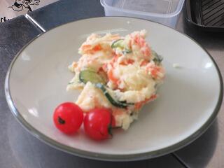 この班は、ポテトサラダにしたようです。マヨネーズなどで味付けをして、盛り付けました。見栄えよくミニトマトを飾っています。