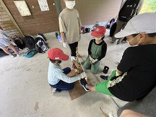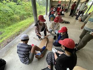 火起こし体験の様子です。当日は雨が降って湿度が高く、なかなか上手くいきませんでしたが、根気強く友達と協力する姿が見られました。