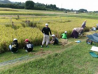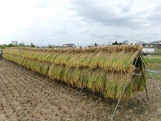 子供たちは、松山さんに鎌の使い方や刈り方を教わり、慣れない手つきながらも一生懸命に稲を刈り取りました。刈り取った稲は、「掛け干し」にしました。