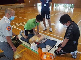 水曜日は都城市北消防署から3名の消防隊員の方を講師に心肺蘇生法研修会を行いました。新型コロナウイルス感染症拡大の影響で一時中止となっていましたが、緊急事態宣言も解除され、消防署からも講師派遣の了承をいただき研修会が実施できました。