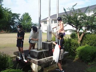 さて、毎朝、集会・運営委員会の子供たちが輪番で旗(国旗、市旗、校旗)あげをしています。雨の時は掲揚しないので、今日は久しぶりの旗揚げでした。旗も元気にはためいていました。毎朝、忘れずに掲揚してくれています。