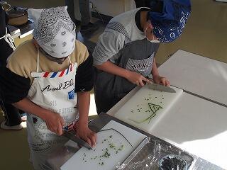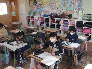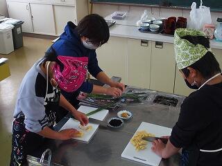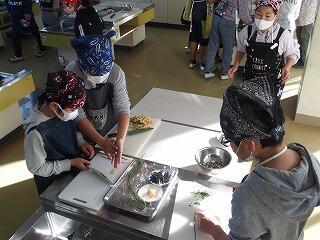 本校には新型コロナウイルス感染症対策のため、子どもの学びの保障をサポートする目的で学習指導員を2学期から1名配置していただいております。調理実習についても、クラスの人数を半数にして、学級担任が家庭科室で調理実習を行い、残りの子ども達は教室で学習指導員による書写の授業を行い、それを交代で実施する「分散授業」の形態を取ることで、密な状況を低減する措置を取っています。もちろん、授業中の換気やマスク着用、手指の消毒はしっかり行っております。