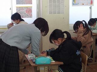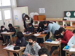 6年生は学級の人数が多いので、教科によっては、密を回避するため学級を2つに分けて分散授業を実施しています。分散授業は感染防止対策が一番の目的ですが、同時に少人数のため個別に対応でき、よりきめ細かな指導を行うことができています。他学年が臨時休業中のため、担任以外の職員も一緒に個別の指導にあたり、6年生の子どもたちの学びの充実のために全職員で取り組んでいます。