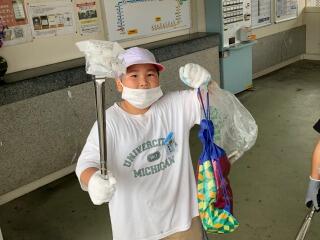 「たくさん拾えました!」と楽しみながらも一生懸命ごみを拾うことができました。その中で、「こんなごみもあるんだ」「お菓子の袋やたばこの吸いがらが多いな」など町の様子で気付いたこともあったようです。