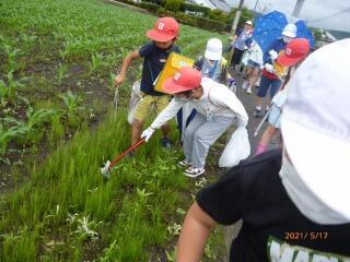 4年生が、総合的な学習の時間の学習で17日(月)に町のごみ拾いに行きました。飯起公園方面、あじさい公園方面、山之口駅方面に分かれて、道路や公園、駅のごみ拾いをしました。