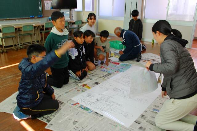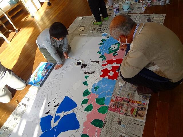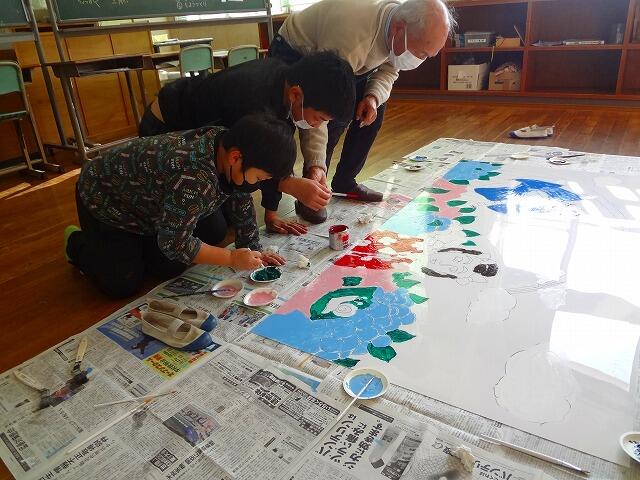 この功績を広く県内外の方々にも広めようと、「人形浄瑠璃伝承校」の看板を制作中です。地域公民館長の艮憲栄様(元中学校美術教諭)の御指導のもと、児童が大きなパネルに2枚の絵画を描いています。一人一人が絵筆を持ち、真剣な表情で色を重ねており、いよいよ完成も間近です。