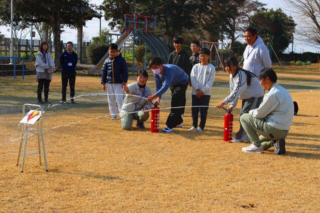 運動場では、カミムラ電気の方に消火器の使い方の説明を受けた後、火元に向かって水消火器で消火練習をしました。