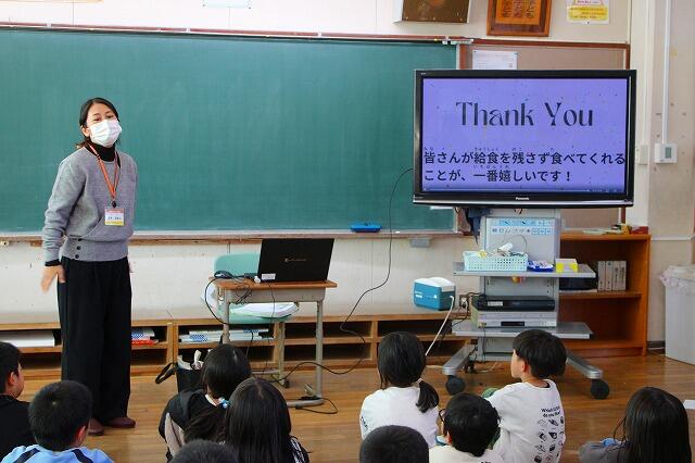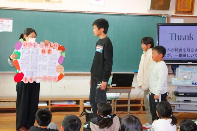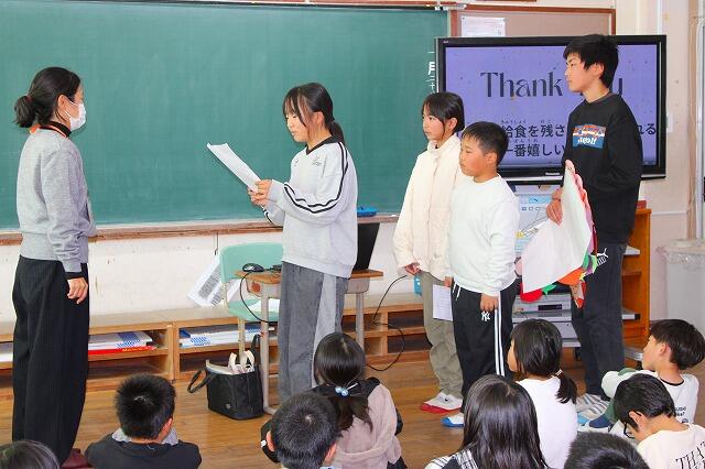 山之口給食センターから栄養教諭の黒木先生をお招きし、給食センターで毎日どのように給食が作られているかを動画で学習した後、全校みんなで作った寄せ書きを贈呈しました。