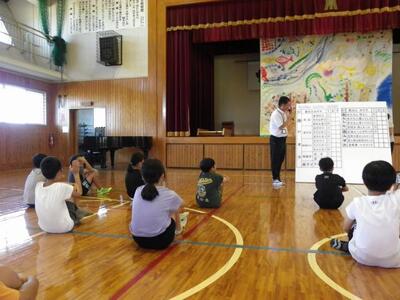 登校日 子どもたちは元気な様子でした。全校集会では、校長先生が夏休みに、山之口に建設中の陸上競技場を見学された話など校長先生の夏休みのお話でした。子どもたちは、聞く姿勢がよく、生活リズムよく過ごしているのだなと感じました。