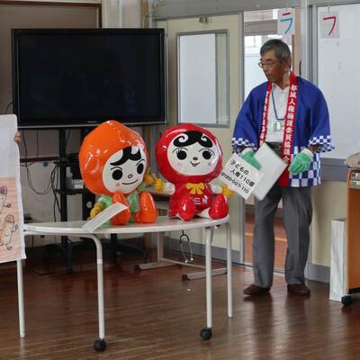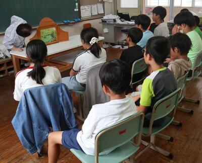 麓小学校では、毎年5・6年生が地域の異世代間による交流活動として、総合的な学習の時間で伝承活動を行っています。今回初めて浄瑠璃人形を手にした5年生は、人形の顔や手の動きの仕組を知ることができました。また、6年生は、おもな配役を自分達で話し合って決め、人形師と太夫(語り)に分かれてさっそく練習が始まりました。