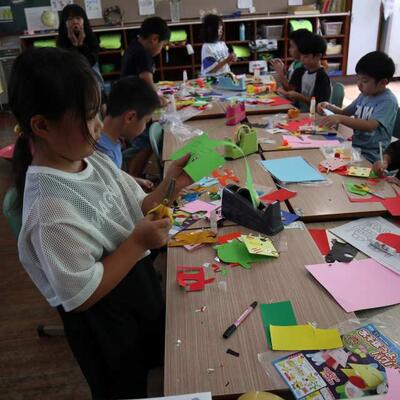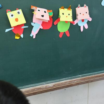1・2年生の図工の様子です。色とりどりの画用紙を切ったり貼ったりしながら、「パクパクさん」を作りました。みんなでワイワイと楽しそうな様子です。このパクパクさんは、これから、朝の挨拶に参加するそうです。笑顔のあいさつができそうですね。