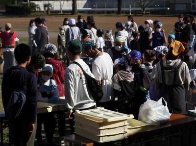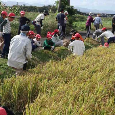 10月15日(水)に稲刈りをしました。地域ボランティアに13名参加していただき、6月に植えた麓っ子米の収穫をしました。