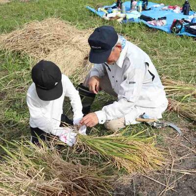 稲刈りが行われました。天気に恵まれ、予定より短時間で刈ることが出来ました。刈った稲を藁で結ぶことも経験しましたよ。これから、稲をかけて干し、脱穀を行います。お手伝いいただいたボランティアの皆様ありがとうございました。