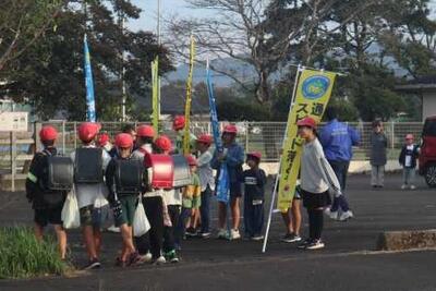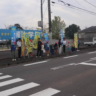 鮮やかなのぼり旗を掲げて、学校前を通る車に向かって元気よくあいさつを行いました。