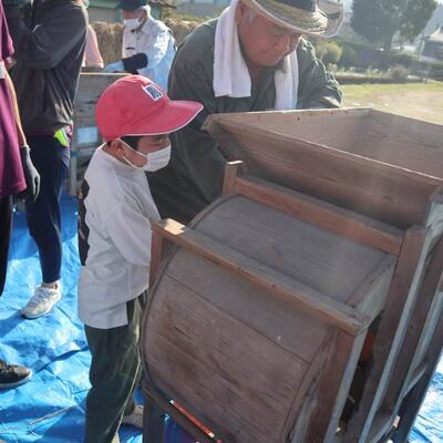 10月に刈った稲を脱穀しました。11名のボランティアの方、3名の保護者の方の協力の下、足踏み脱穀機、唐箕を使いました。高学年は慣れたもの!1年生はおそるおそる脱穀機に稲穂を入れていました。足踏み脱穀機を踏むと鳴る「ブーンブーン」という音、唐箕を回すハンドルの手ごたえ等、めったにできないことを体感しました。1粒1粒大事にし、133㎏の収穫がありました。12月のもちつき大会が楽しみです。