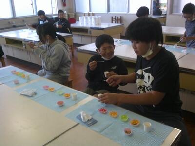 味覚について、嗅覚と味覚、調味料の組み合わせによる味、などの内容を、子どもたちは実際に味見をしながら学びました。私たちが食べている料理は、味だけでなく、触覚や視覚もおいしさを感じる要素となっていると教えていただきました。味覚の授業を受けて、何気なく食べている日ごろの料理の素材や調味料について意識を向けるきっかけとなりました。家庭科を担当している先生は、「味覚について知ったことで、みんなの好き嫌いが少しでも減るといいです。」と話していましたよ。