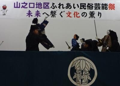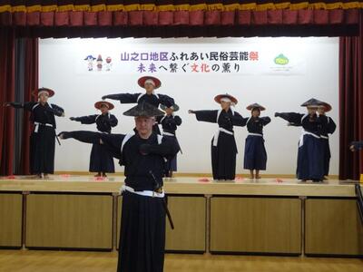 六十田剣舞は、山之口町麓地域の六十田地区で受け継がれてきた都城市指定無形民俗文化財です。日露戦争に出征した藤井政時氏が戦友から習った剣舞を、地元の若者教育に役立てたいと願い郷里に持ち帰り、地元に広めたものとされています。現在、「六十田剣舞伝承サークル」として、保存会の方の御指導のもと、毎年運動会や地域の祭りで披露するために練習しています。黒色の紋付き袴姿に鉢巻、腰に刀をさして勇壮に舞います。