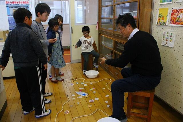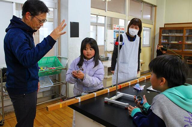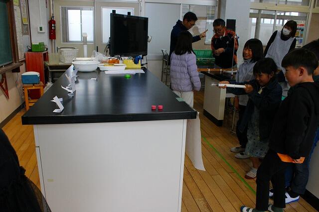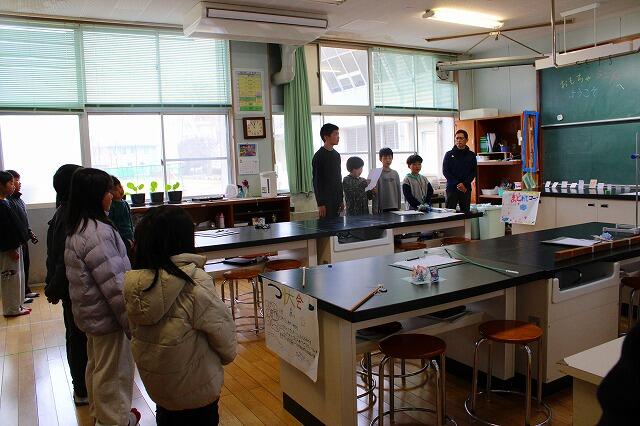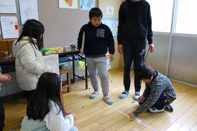 理科室に1・2年を招待し、おもちゃやゲームの遊び方を説明した後、自由に触れて遊ぶことができる楽しい時間です。タイムや得点を競う遊びが多く、下級生が夢中になって遊ぶ様子を3・4年生が応援したり、コツを教えてくれたりして、楽しい交流ができました。
