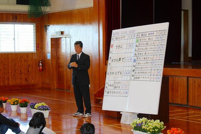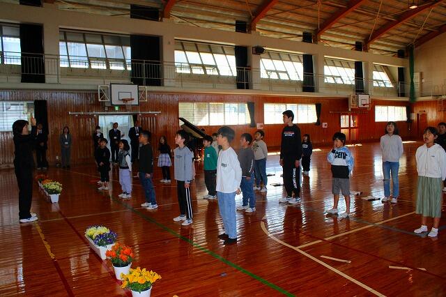 本年度最後の全校集会です。3月の目標は「感謝の気持ちを持とう。」です。校長先生からは、友達を大切に安心な学校に、交通安全だけでなく空き家や他所の家に入らない安全な生活をしようというお話でした。生徒指導の先生は「自分から感謝の気持ちをもってしあわせな人になろう」というお話でした。