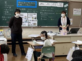1年生は、国語でことばをみつけようの学習をしています。例えば、「みかんの中にはかんがある」みたいに単語の中にあることばをみつけたり自分たちで文章を考えたりしていました。2年生は、算数で「はこの形」について学習していました。面の形についてどんな形がを調べていました。