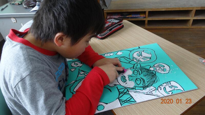 先日は3年生の版画作成の様子をお知らせしましたが、今日は5年生です。さすがに2度行っているので、彫刻刀の使い方もなかなか上手です。細かなところも、上手に表現できています。印刷用紙も、依然と違いカラーの作品に仕上げることができます。出来上がりが楽しみです。