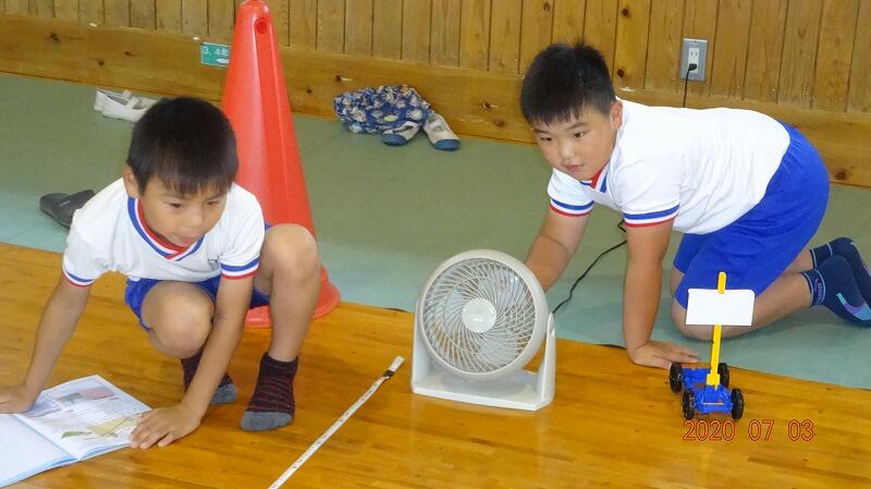 3年生の理科学習です。今日から、風の働きについて学習を行います。体育館で、風の強さで自動車がどのくらい動くかを調べました。記録をきちんと行い結果をまとめることができました。