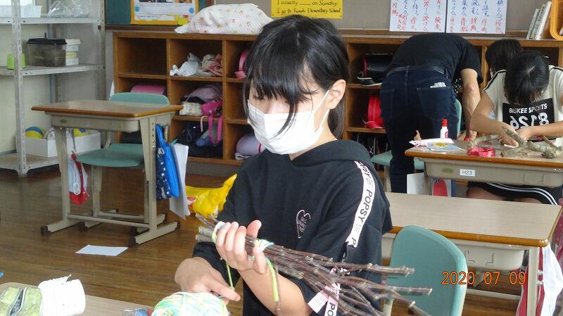5・6年生が図工の時間に、小枝と布を使って作品作りを行っていました。一人一人が自由に発想してイメージを膨らませながら、のこぎりで枝を切ってまずは、部品作り。その他とに、布を絡ませながら作品を完成させていました。