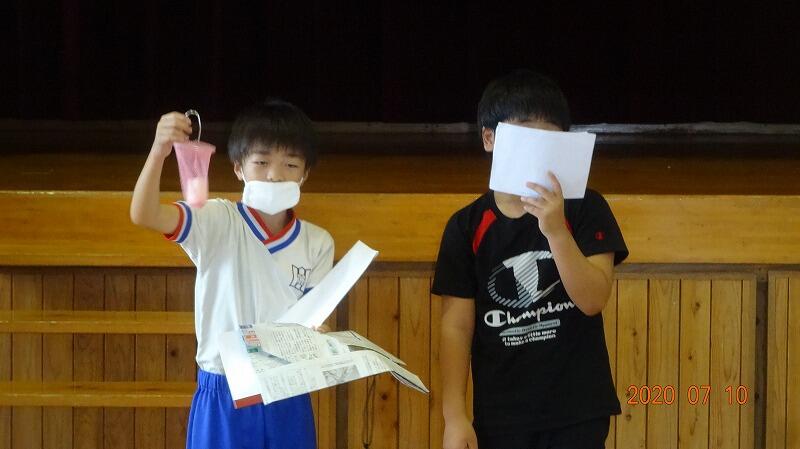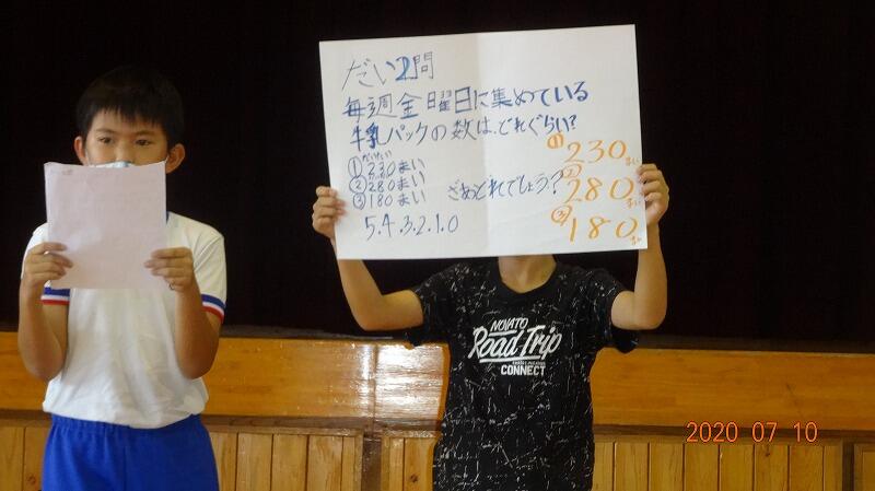 児童集会で保健・体育委員会の活動内容について活動内容の紹介がありました。毎朝の給食献立黒板の記入や牛乳パック回収や手洗い石鹸など日々活動していることについて、クイズ形式で行いました。