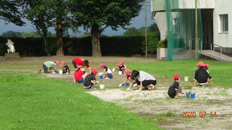 朝は雨が降っていなかったので、運動場の草取りを全校で行いました。この時期は、雑草の生長もめざましくすぐ大きくなってしまいます。一度にはきれいに整備できませんが、機会をみて少しずつ作業を行っています。