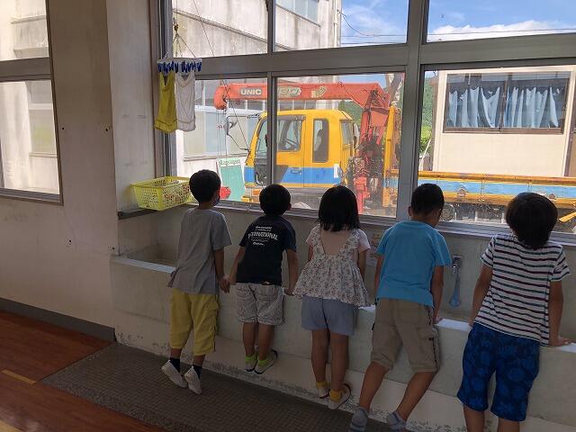 おおよそ1か月程度かかりましたが和式トイレを洋式トイレにする工事が行われていました。工事の方の休憩場所であるプレハブが次の工事場所である冨吉小へ移動する様子を1年生が見ていました。おおよそ1か月間ありがとうございました。
