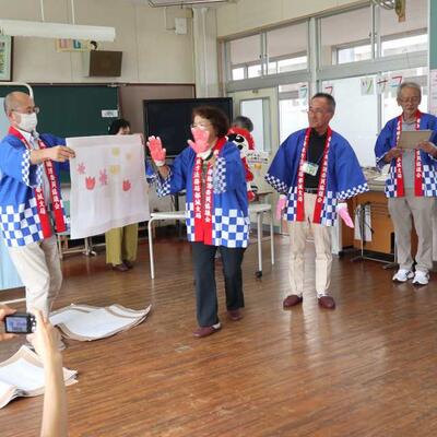 麓小のすぐ近くにあるグループホーム「城山苑」に、先日収穫したもち米「麓っ子米」を贈呈しました。ちょうど、デイサービスに来られている高齢者の方々とも交流することができました。