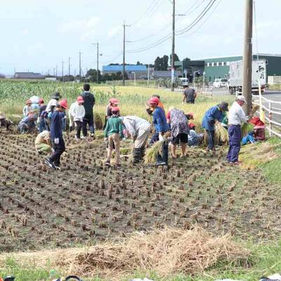 台風の影響もなく立派に育った黄金色の稲を、鎌を持つ手に力を込めながら丁寧に刈り取りました。とくに毎年経験を積んでいる5・6年生は、手際よく刈り取ったり束ねたりでき感心しました。また、初めて体験する1年生に寄り添いながらコツを教える優しい姿も見られました。
