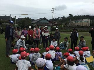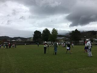 その後、グランドゴルフ会の方々に来ていただき、グランドゴルフを楽しみました。地域の方々に優しく教えていただき上手になりました。また、地域の方々のうまさにもびっくり。雨が心配の中でしたが、楽しいひとときでした。ありがとうございました。
