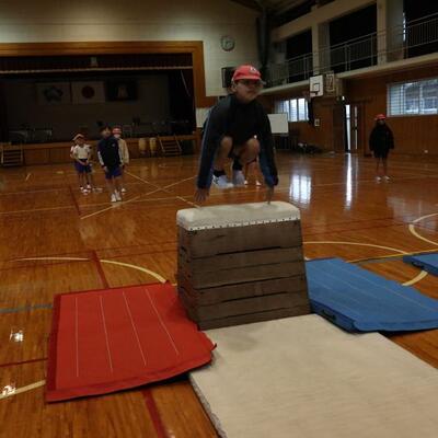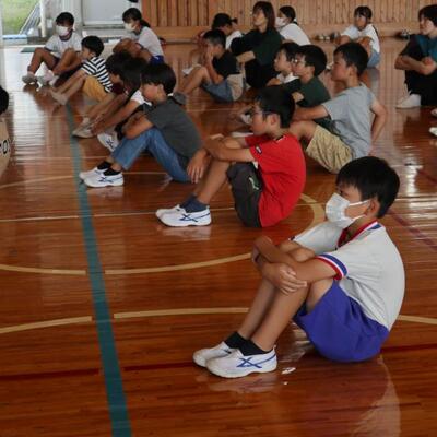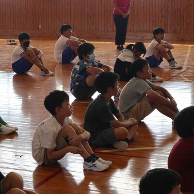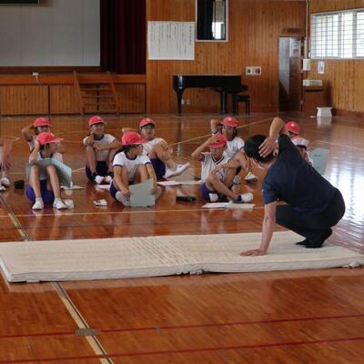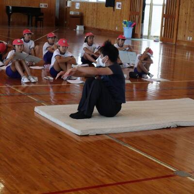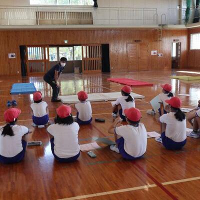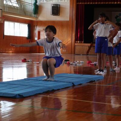 小林秀峰高校より体育の永野護先生にお越しいただいて、先生とのマット運動の学習が始まりました。今日は、前転運動の基礎となる手の付き方やマットに接する頭の部分を1つずつ確認しながら学習しました。次の技にそなえるために、足はそろえて立てるよう、帽子を股にはさみ、落とさないように前転してみる等、分かりやすく教えていただきました。これから、6時間程学習が続きます。子どもたちの技の習得が楽しみです。