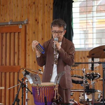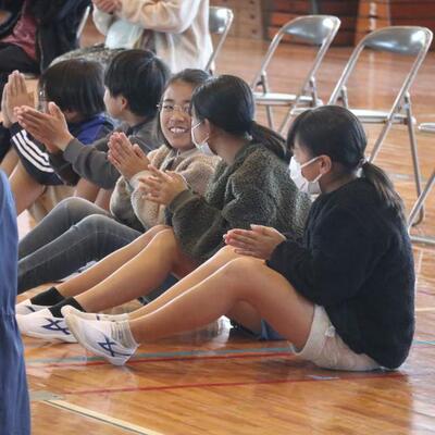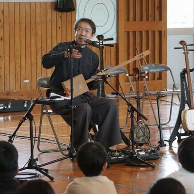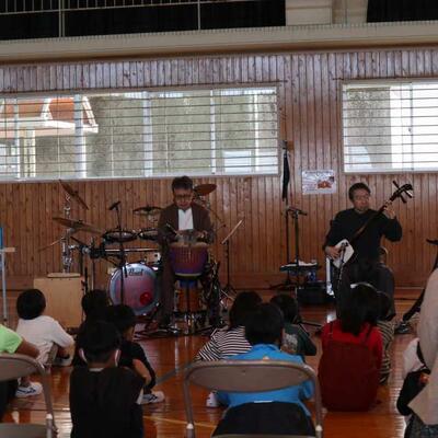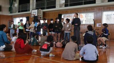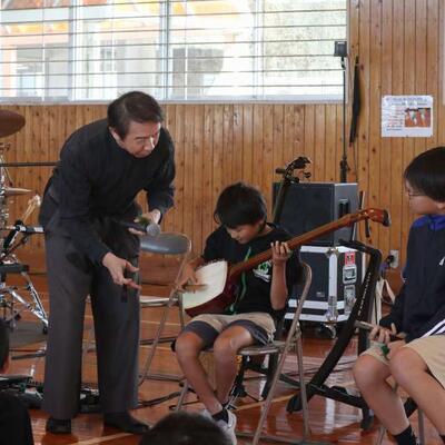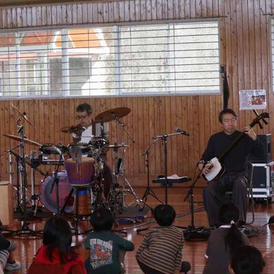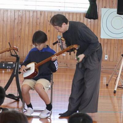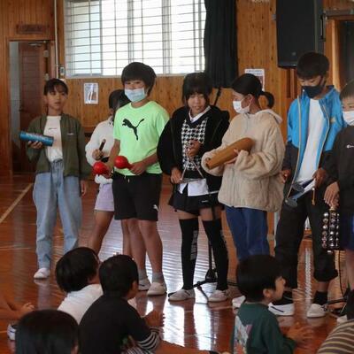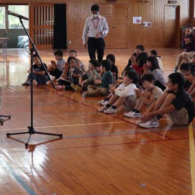 都城市アウトリーチ事業 「温故知新」さんの演奏会が行われました。三味線とパーカッションのセッションを聴かせていただきました。三味線やごったん(山之口で作られた三味線)、パーカッションの様々な楽器を教えていただきました。また、体験タイムもあり、代表児童が三味線を弾いたり、初めて演奏する打楽器でリズムを打ったりしました。心地よいリズムに思わず手振りでリズムをとる友達もいましたよ。温故知新さんのお二人のオリジナル曲には異国情緒あふれるものもあり、いつもの体育館が、音楽ホールへと変身しました。本物に触れ、音の迫力・振動・美しさなどなど心に響く時間を過ごしました。温故知新さん、MJホールの皆様、素敵な時間をありがとうございました。