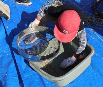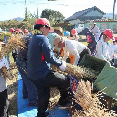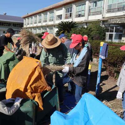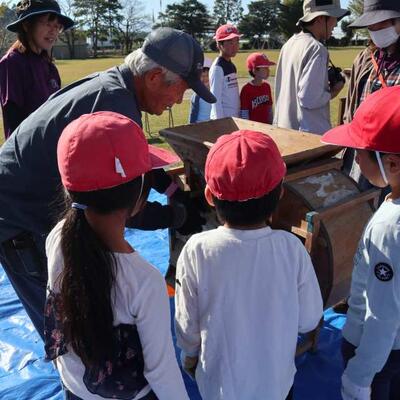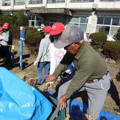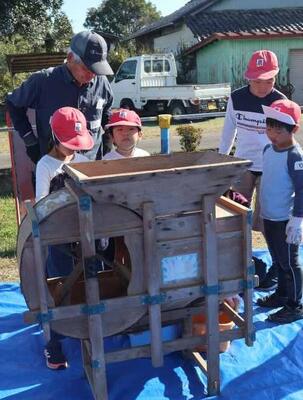 脱穀が行われました。今年は、地域の方が唐箕を1台貸してくださり、足踏み脱穀機3台、唐箕2台で行いました。1年生は、始めてみる唐箕に興味津々でした。また、ふるいでふるって、より分ける作業もあり、全員で協力しました。米作りボランティアの皆さまのおかげで、約130キロの収穫がありました。次は餅つきです。