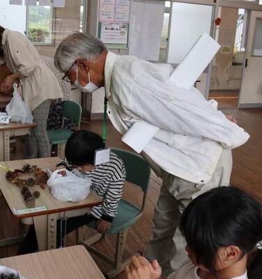 今週火曜、木曜、金曜は学校運営協議会の委員の皆さんに授業を参観していただく期間でした。写真は、1年生の生活科:秋の木の実を使ってリース作りを行っている様子です。委員の方に、木の実の名前を教えていただく場面もありました。授業の様子を見ていただき、よりよい学校運営への御意見をいただき、支えていただいています。