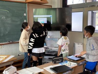 5年生算数は、問題を解く際に、PCに個人でどのように解いたかを表して発表し、4人でよりよい解決の話合いを行っています。普段は、PC画面を共有し合いながら、席について話し合いをしているのですが、昨日は、「こっちがいいんじゃないか。」「○○さんの考えのこの部分が分かりやすい」等、話し合いが盛り上がり、「先生、黒板も使っていいですか?」や4人が自然とテレビ画面に集まり、ああでもない、こうでもないと白熱していました。学びに集中して向かっている5年生です。