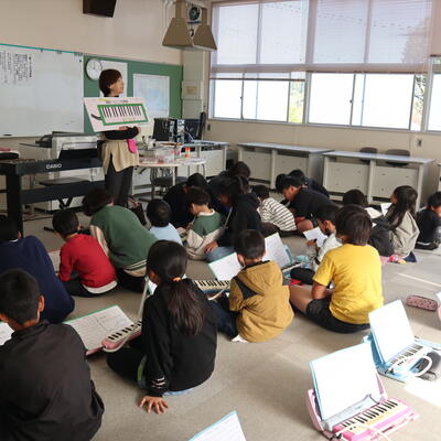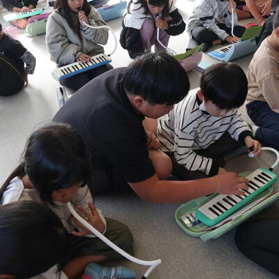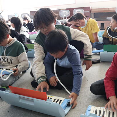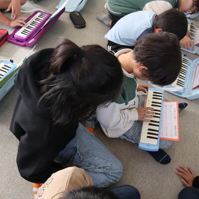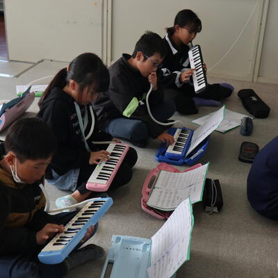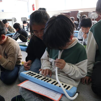 麓小学校は全校児童が少ないことをいかして、全校音楽や全校体育の時間があります。1~6年生で力を合わせて競技をしたり、合奏をしたりします。今日の全校おんがくでは、新しい合奏曲の練習でした。鍵盤ハーモニカで主なメロディー部分の練習です。1年生や2年生には、6年生がマンツーマンで教えてくれました。6年生が弾いて見せてくれている写真もあります。兄弟のように仲良しなのが伝わってきます。合奏曲の仕上がりが楽しみです。