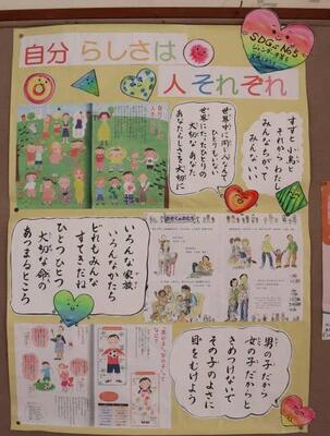 山之口中学校区合同4校の徳育部会では、ジェンダー平等実現について児童・生徒への啓発をどのように行えばよいか取組みの工夫を行っています。写真のような掲示物で、子どもたちに分かりやすく伝えています。