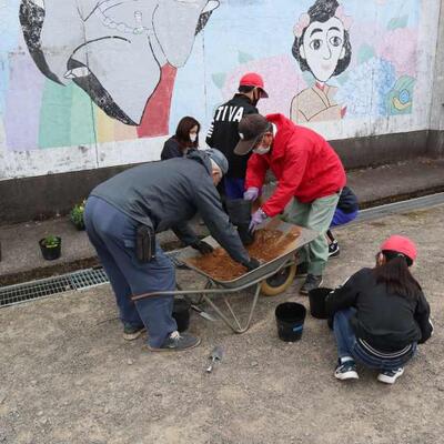 協力して花壇の手入れを