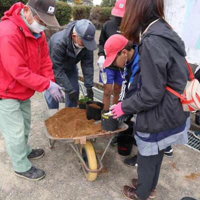 とても寒く冷たい日でしたが、13名ものボランティアの方々が来校して下さり、一人5鉢運動を行いました。卒業式・入学式を美しく彩る花々を全校児童で育てていきます。毎年、地域ボランティアの皆さんに助けていただきながら植栽します。今年は、みんなの力で、例年以上にたくさんの鉢に植えることができました。そして、自分たちの学級花壇にも花を植えました。麓の冷たい風にまけず、懸命に生長し、たくさんの花を咲かせます。その花が咲くのを楽しみに、子どもたちはこれから毎日水やりを欠かさないでしょう。命を大切に育む気持ちも育ちます。ボランティアの皆様、寒い中、作業を手伝ってくださり、本当にありがとうございました。