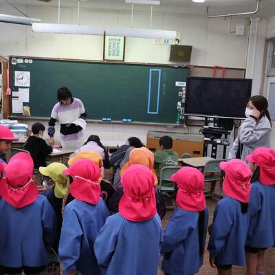石山・有水・高城保育園の皆さんが学校見学に来てくれました。小学校にあるものが珍しく、キョロキョロしていましたよ。廊下を1列で静かに歩いたり、履物をそろえたり、とてもマナーがよい保育生でした。来年からは、1・2年生と交流できるといいなと思います。