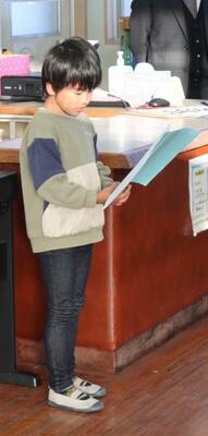 2年生と5年生児童は、これまでの自分を見つめて考えた今年の抱負を作文発表しました。さらに自分を伸ばしたいところをしっかりと言えました。