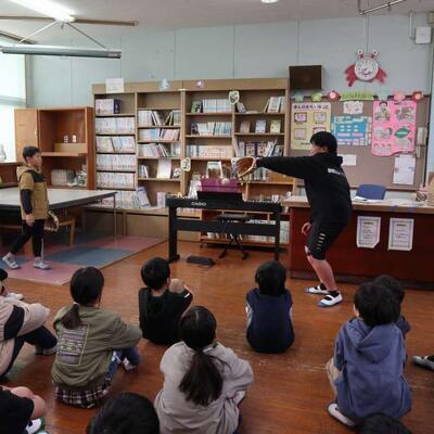 また、大谷翔平選手からのプレゼントのグローブの披露もありました。室内ですが、少しキャッチボールもしましたよ。大谷選手からの「野球やろうぜ!」のメッセージに笑顔が広がった子どもたちでした。