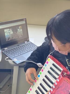 2月の参観日で発表する合奏曲の個人練習をしている様子です。担当楽器を演奏できるようになったら、次は、他の楽器とテンポを合わせなければいけません。しかし、今はまだ、それぞれが担当楽器の練習中ですので、まだ合わせることができません。そこで、弾けるようになった児童は、PCを活用して練習です。担任の先生のお手本の演奏動画を見ながら、合わせられるように弾いています。PCを活用して、演奏技術を高める個人練習ができるのですね。
