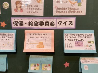 保健給食委員会の4~6年生は、みんなの健康のためにクイズを考え、掲示物を作りました。それぞれがテーマを選び、イラストを描いたり、PCで作成したりと個性が表れています。低学年の友達がこのクイズに挑戦している姿も見られます。学校・友だちのためになることを自分たちで考え、工夫した活動を行っています。