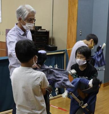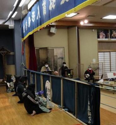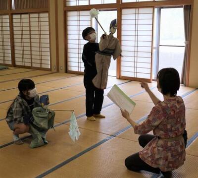 人形浄瑠璃3月公演(3月12日)まで約1か月となりました。子どもたちの練習もあと数回です。今日は、保存会の先生方が7名も来て下さり、指導していただきました。そして、語り大夫は三味線と初めて合わせました。人形を操る子どもたちは、本番でかぶる頭巾をかぶっての練習です。語り大夫も人形を操る子たちも、これまでとは違った課題が見えたようです。「ずいぶん上手になったよ。」「そうそう。」「こうするといいよ。」と保存会の先生方は、とても励ましてくださり、そして、分かりやすく教えてくださります。今日はこれまで以上に、力がこもった練習となりました。来て下さるお客様のため、お家の方のため、最後まで練習を頑張ります。